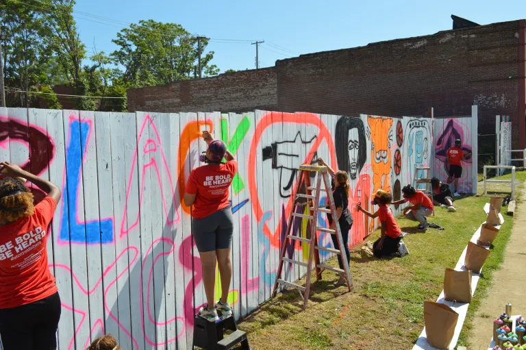 At Saint Louis Story Stitchers , visual art is a powerful tool for youth expression, storytelling, and community impact. Our young artists have contributed to large scale public murals alongside notable artists such as Katherine Bernhardt and Simile Sudduth, gaining hands on experience in collaborative art making that shapes the cultural landscape of St. Louis.